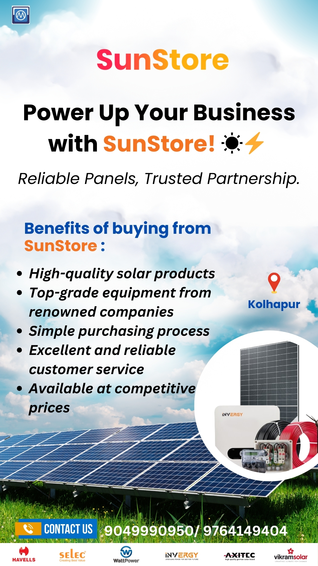 SunStore Solar is bringing top-tier solar equipment to South Western Maharashtra! With a new showroom opening soon, we're making solar more accessible than ever. Get ready for competitive prices on panels, inverters, and more!